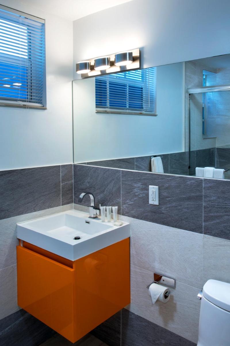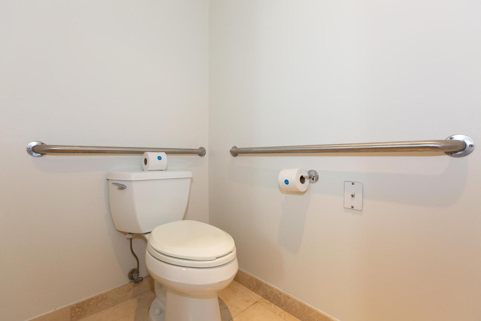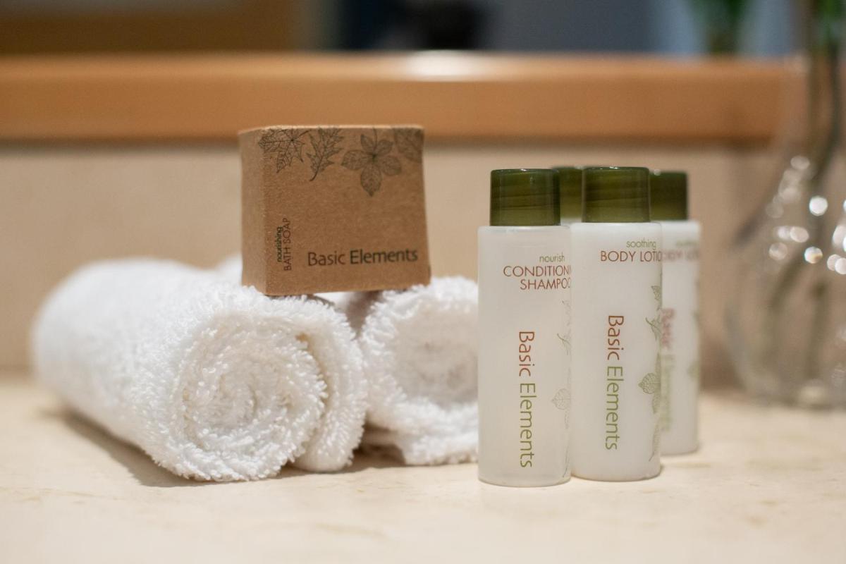 Bathrooms are bright and functional, with glassed-in showers and tiled walls. Fridges, wardrobes, and desks appear in-room photos, underscoring the aparthotel’s practical nature.